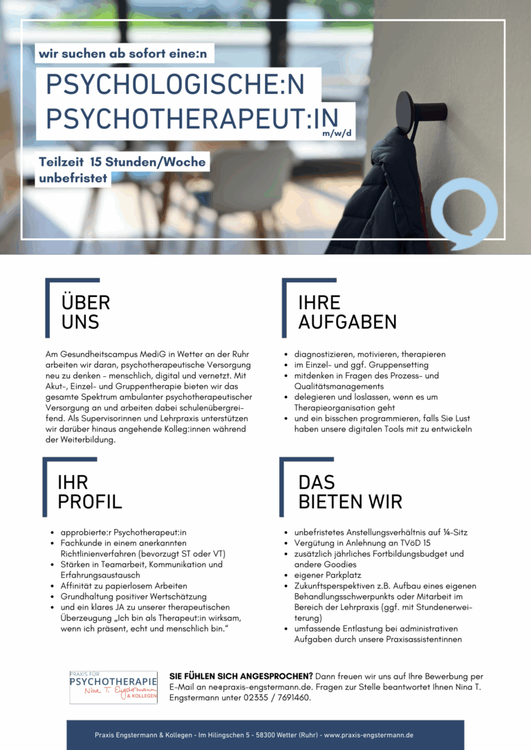 Wir verzichten gerne auf aufwändige Bewerbungsunterlagen. Bei Interesse an einer Mitarbeit in unserer Praxis genügt zunächst eine E-Mail an ne@praxis-engstermann.de. Alles Weitere besprechen wir gerne mit interessierten Kolleg:innen im persönlichen Gespräch.